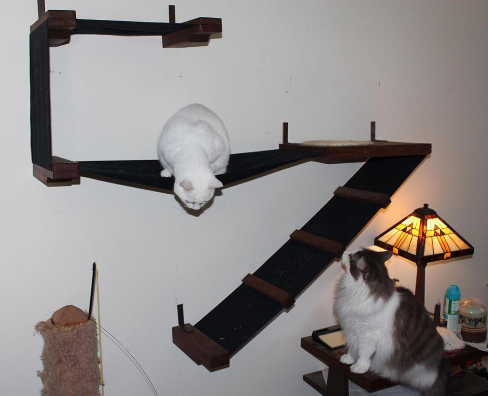 Cats playing on wall gym.