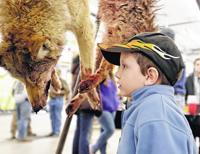 Disturbing photo of young boy examining slaughtered coyote